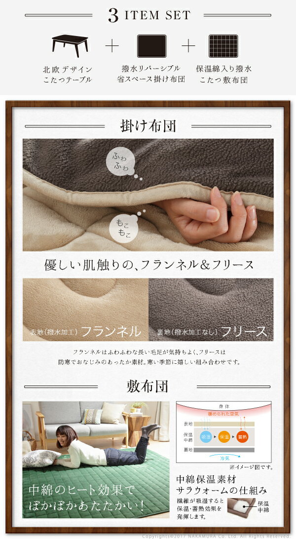 こたつ 北欧 長方形 北欧デザインスクエアこたつ 〔イーズ〕 120x75cm+はっ水リバーシブル省スペース布団+フランネル敷布団 3点セット セット こたつ布団 あったか コタツ テーブル 座卓 おしゃれ リビング ロー 天然木 ウォールナット オーク